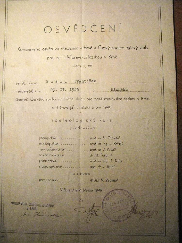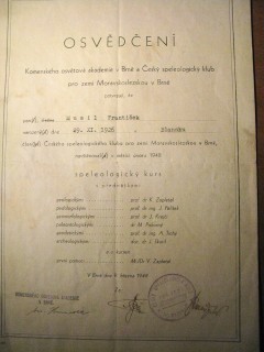Poznámky webmistra: K výše uvedenému mám jednu poznámku a dvě doplnění. I když je autor na půl úvazku zaměstnancem správy CKOMK, jedná se o jeho osobní názor, nikoliv stanovisko správy CHKOMK. Jako doplnění jsem vložil certifikát o absolvování KURSU SPELEOLOGIE. Jak tentýž kurs byl pojat Českým Speleologickým klubem pro zemi Moravsko-Slezskou v Brně, v roce 1948 pod vedením Antonína Bočka...Zjevný rozdíl mezi oběma kursy nechť si každý uvědomí sám. Kdo chce být v obraze, jak to vypadá se současnými speleologickými kurzy, stačí zadat toto heslo do googlu (3980 odkazů).