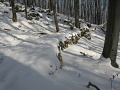 Minulý pátek bylo opět krásné počasí. Jelikož jsem musel na sobotu do továrny, využil jsem toho k návštěvě jižní části Moravského krasu. Povrchovou exkurzi jsem začal na plošině Skalka, SV od Ochozu. Ranní námraza bělostně zářila oproti azurovému nebi, opuštěný a prázdný kras v pracovním dni mě takto vítal v Novodvorském údolí. První zastávkou byl Novodvorský ponor. Základnu Speleohistorického klubu jsem málem nepoznal. Kdysi, ještě těsně před odchodem posledních dvou skupin Pustožlebské a tehdy Novodvorské (dnes Speleohistorický klub Brno ZO 6-26) ze Speleoklubu Brno, Marek Šenkyřik vybral dobré místo ke stavbě srubu. Datum si nepamatuji, ač bych měl, protože vzápětí vznikly dvě nové ZO, ale mohl to být rok 1988. Markovi jsem byl u zakládání stanice jednou pomoct. Měl jsem už nějaké zkušenosti ze stavby srubu na Oslavce, tak jsem mu navrhnul aspoň zadlabat a sroubit kulatiny na základní konstrukci stavby, protože jinak se z toho klubala kůlnička na dřevo. Prozíravost a důslednost se Markovi osvědčila, srub stojí dodnes.