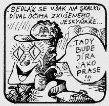 Nejen Sedlák na skalku v zákrutu cesty pod Kůlnou ze známého románu Po stopách ztracené řeky od kovaného soudruha Karla Šebely. Někteří jeskyňáři se zkušenýma očima se dívají i na nové objevy ve Sloupě. Tak ještě upřesním, o víkendu se zmapovalo přes jeden kilometr téměř k severu, 300metrů odhadnuto, které míří SZ směrem. Celkově by se měl konec nacházet blízko prostor za Šachtou za Evropou a Indií. Veškerá délka chodeb se patrně bude pohybovat kolem 1,5 km a ještě nevíme co bude v komínech...Na jednu z mnoha zpráv jsem narazil na Idnes, a videíčko na Centrumu (adresu dodal Piff). Jinak zpráva, nebo spíše pracovní teorie se připravuje. Obrázek je z připravovaného stejnojmenného komiksu Po stopách ztracené řeky od Vendelína Karbita...